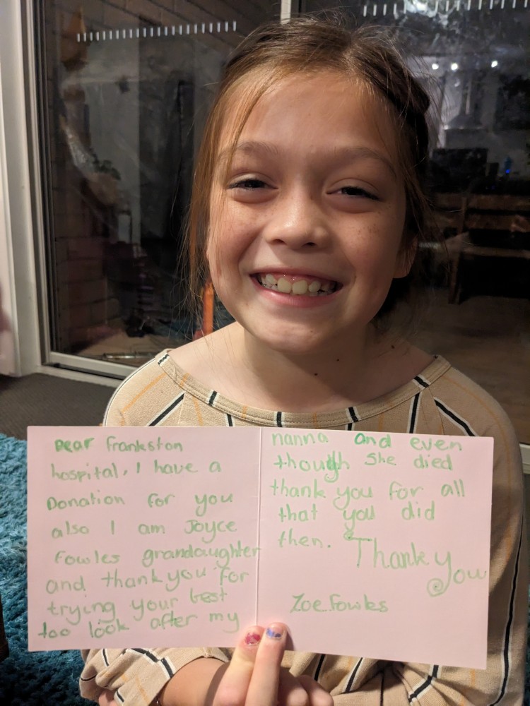 Eight-year-old Zoe is a budding philanthropist, donating to Frankston Hospital in memory of her Nanna, Joyce Fowles, who passed away from cancer last year.