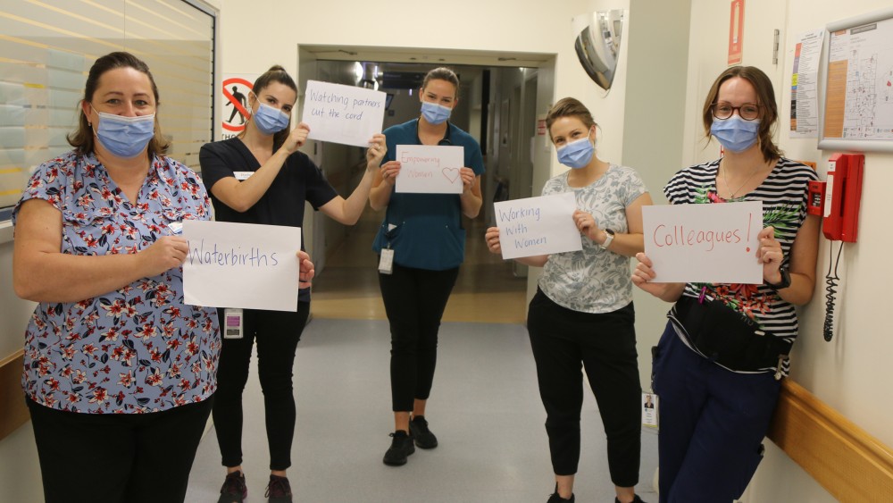 A group of Peninsula Health midwives responding to the prompt: “The thing I love most about being a midwife is…”.