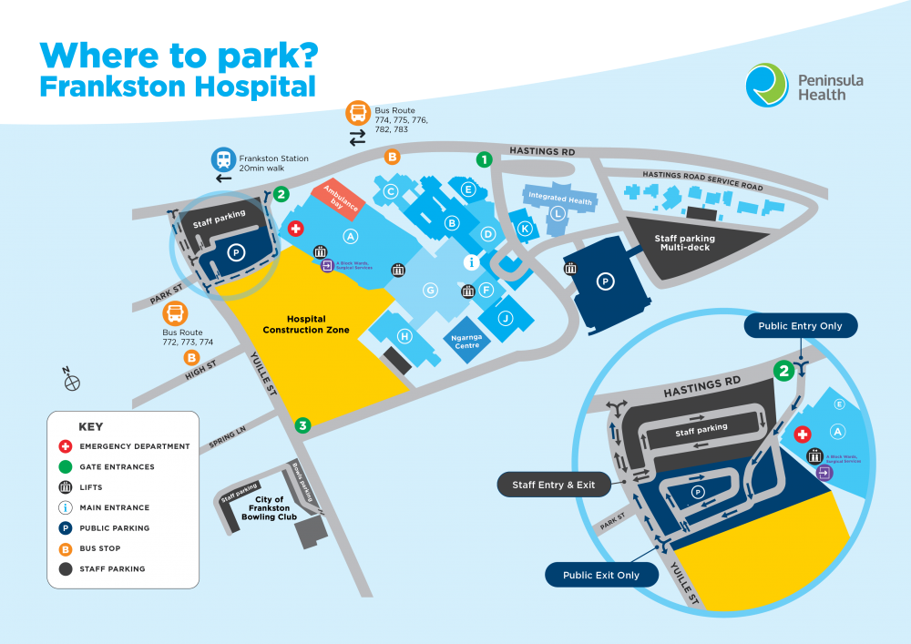 Parking access for the Frankston Hospital Emergency Department and A-Block wards is available through Gate 2, Hastings Road.